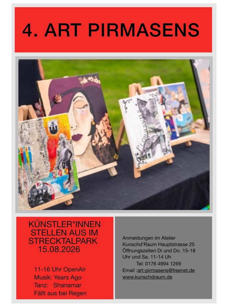 Mit unseren Exponaten, Ständen und Staffeleinen entsteht durch die KUNSTVOLL ein kleines Zweibrücker „Montmartre“. Präsentieren Sie sich und Ihre Arbeiten: Acryl- und/oder Aquarellmalerei, Zeichnungen, Gegenständliches, Fotografie usw. … alles geht. Bitte verzichten Sie zu Gunsten der Atmosphäre auf Zelte, lediglich Sonnenschirme werden als Überdachung genutzt. Sollte es an diesem Samstag regnen findet die Open-Air-Veranstaltung leider nicht statt.