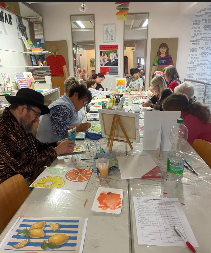 Unter der wunderbaren Leitung von Manuela Sauer haben unsere jüngsten Teilnehmer (ab 6 Jahren) gemeinsam mit ihren Familien dieses ernste Thema auf eine unglaublich fröhliche und kreative Weise erkundet. Was könnte Einheit, Unterstützung und das Recht, zusammen zu sein, besser symbolisieren als viele Hände, die auf einer Leinwand vereint sind? Genau das haben wir getan: Wir haben unsere Hände auf Leinwand gebracht und diese im berühmten, lebensfrohen und farbenprächtigen „Rizzi-Style“ bemalt! Es war ein Tag voller Lachen, Teamarbeit und purer Freude, der bewiesen hat, dass man über wichtige Dinge auch und gerade durch die Sprache der Kunst sprechen kann.